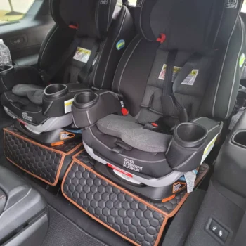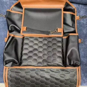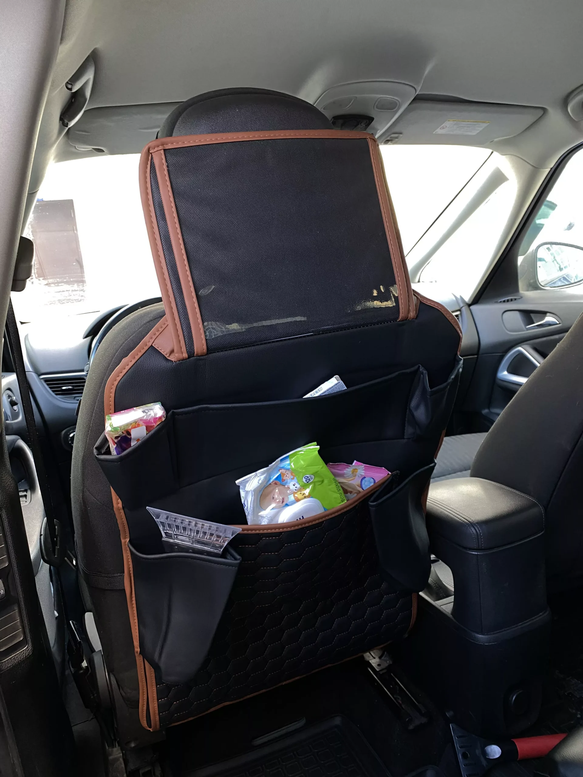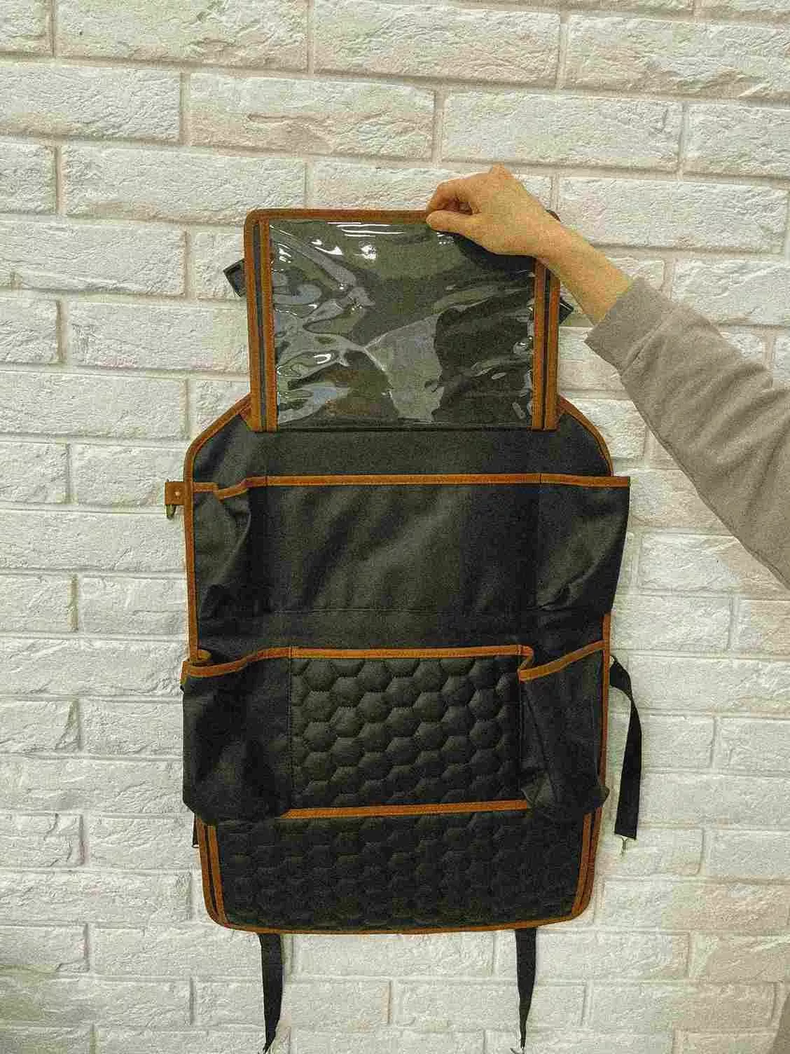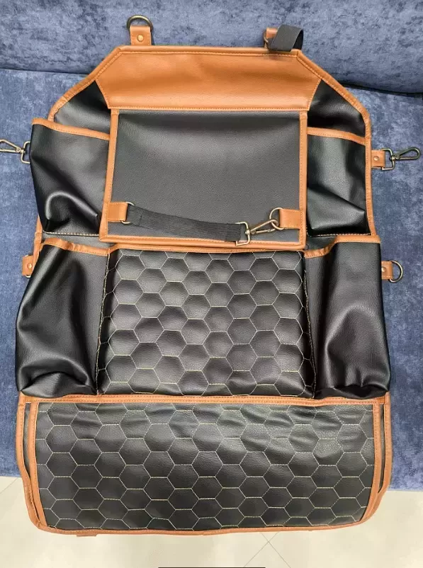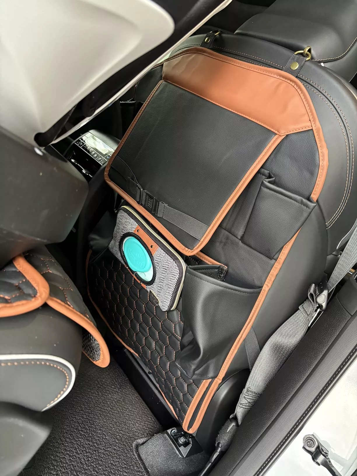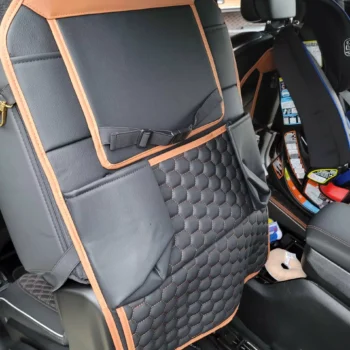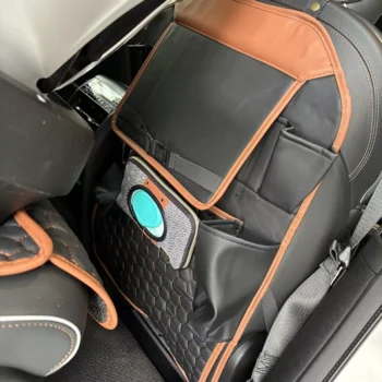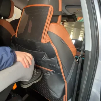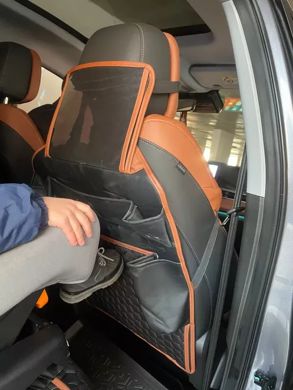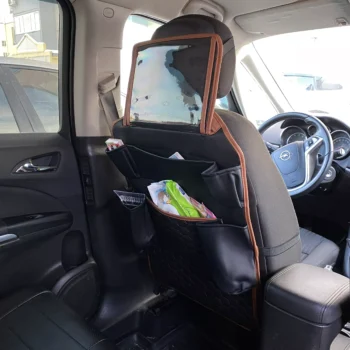 Crafted from smooth eco-leather, this seat organizer is waterproof and easy to clean with a damp cloth. The clear TPU pocket is also waterproof and safe for babies. All the materials used are vegan and non-toxic.